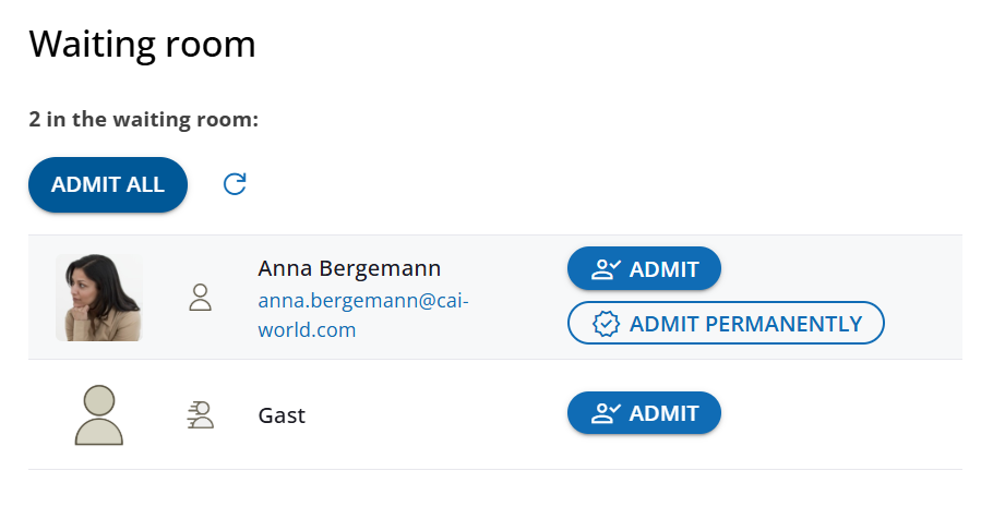 Keywords: ad-hoc session, guest, permanent access, waiting room, admission, entry, permanent entry, kickThe waiting room acts as your digital "bouncer" for maximum confidentiality.