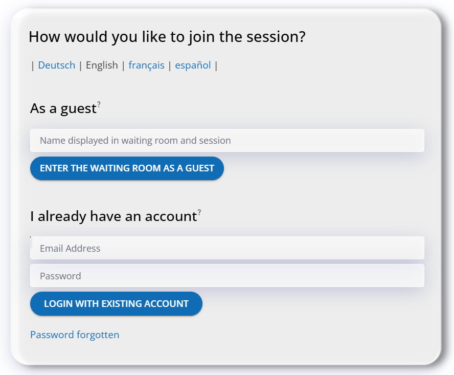 As soon as an invited person follows the session link, they arrive at the waiting room login area. There are two ways to identify oneself: