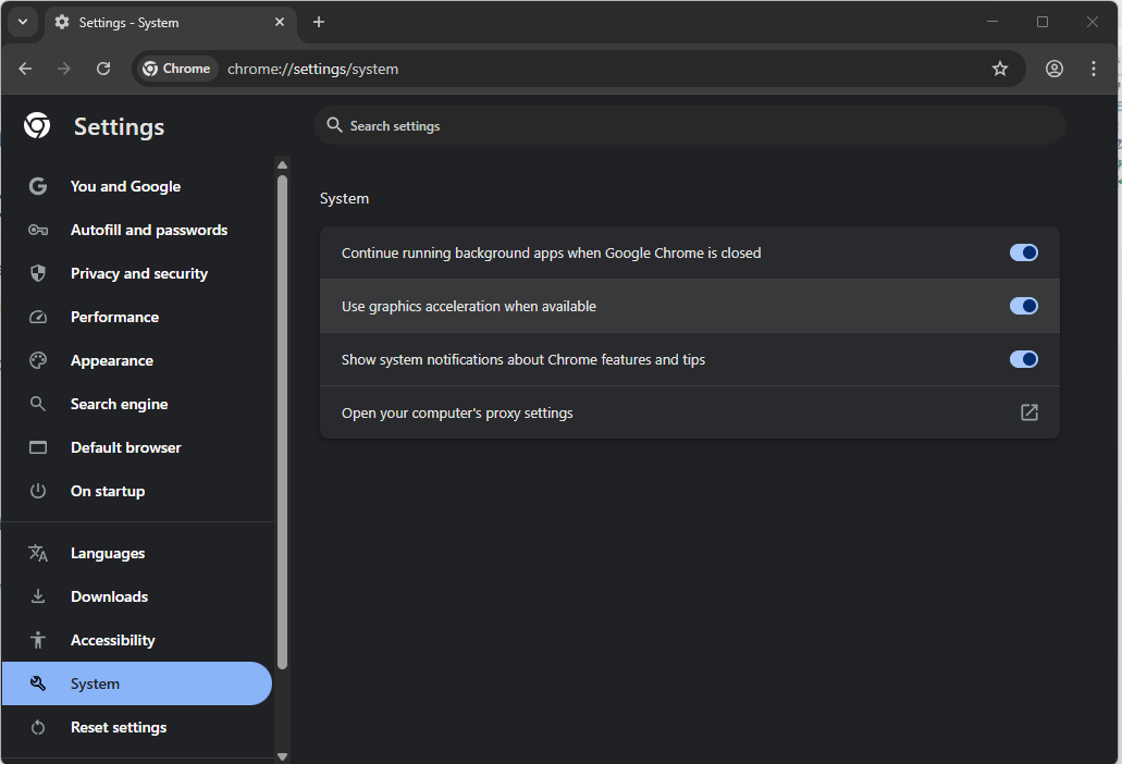 Three-dot menu (Alt+F) → Settings → System and Performance → Graphics Acceleration