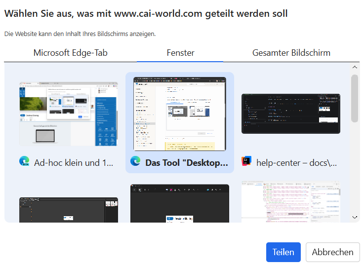 Anschließend wählen Sie im Browser-Dialog aus, was geteilt werden soll:
