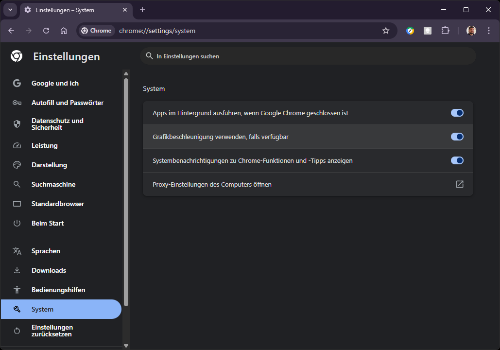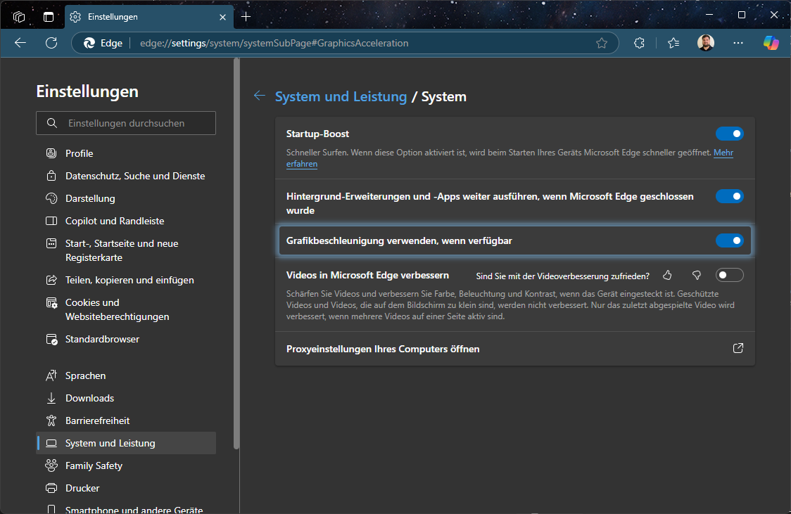 Drei-Punkte-Menü (Alt+F) → Einstellungen → System und Leistung → Grafikbeschleunigung