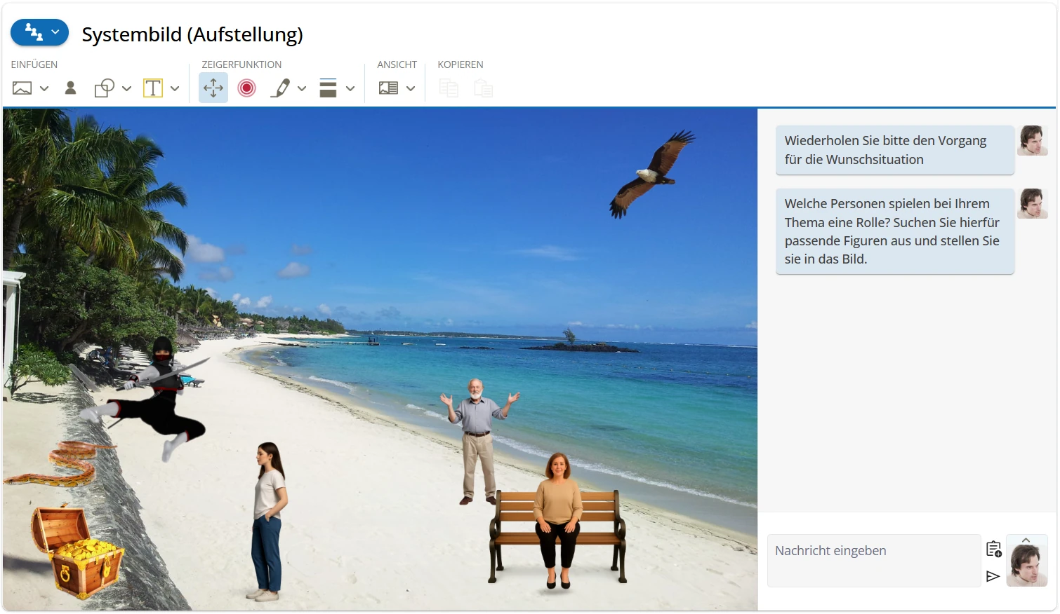 Die spezifischen Funktionen in der Toolbar des Systembilds ermöglichen eine individuelle Gestaltung der Szenerie – von schlichten Figuren auf neutralem Hintergrund bis hin zu symbolisch differenzierten Darstellungen.